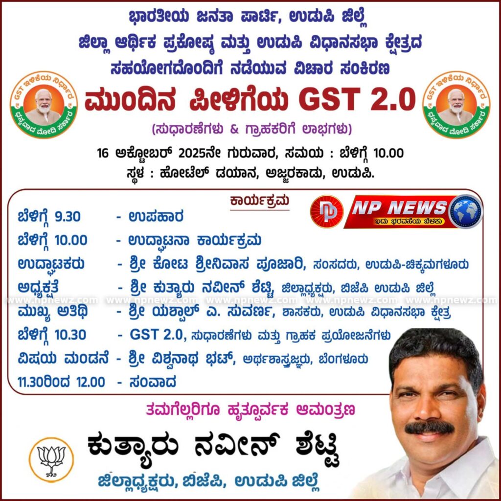 ಬಿಜೆಪಿ ಉಡುಪಿ ಜಿಲ್ಲೆ, ಜಿಲ್ಲಾ ಆರ್ಥಿಕ ಪ್ರಕೋಷ್ಠ ಹಾಗೂ ಬಿಜೆಪಿ ಉಡುಪಿ ವಿಧಾನಸಭಾ ಕ್ಷೇತ್ರದ ಸಹಯೋಗದೊಂದಿಗೆ ‘ಮುಂದಿನ ಪೀಳಿಗೆಯ ಜಿ ಎಸ್ ಟಿ 2.0’ (ಜಿ ಎಸ್ ಟಿ ಸುಧಾರಣೆಗಳು ಮತ್ತು ಗ್ರಾಹಕರಿಗೆ ಲಾಭಗಳು) ವಿಷಯದಲ್ಲಿ ವಿಚಾರ ಸಂಕಿರಣವು ಅ.16, ಗುರುವಾರ ಬೆಳಿಗ್ಗೆ ಗಂಟೆ 10.00ಕ್ಕೆ ಉಡುಪಿ ಅಜ್ಜರಕಾಡು ಹೋಟೆಲ್ ಡಯಾನ ಸಭಾಂಗಣದಲ್ಲಿ ನಡೆಯಲಿದೆ.