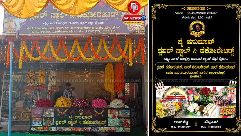 ಬೈಲೂರು: ಸಮಸ್ತ ಗ್ರಾಹಕರಿಗೆ ಸಂತಸದ ಸುದ್ದಿ! ಬೈಲೂರಿನ ರಾಜಾಪುರ ಬ್ಯಾಂಕ್ ಹತ್ತಿರ ಲಕ್ಷ್ಮೀ ಸಾಗರ್ ಕಾಂಪ್ಲೆಕ್ಸ್ ನಲ್ಲಿ ಜೈ ಹನುಮಾನ್ ಫ್ಲವರ್ ಸ್ಟಾಲ್ & ಡೆಕೋರೇಟರ್ಸ್, ಇಂದು ದಿನಾಂಕ 16-10-2025ನೇ ಗುರುವಾರದಂದು ಉದ್ಘಾಟನೆಗೊಂಡಿದೆ.