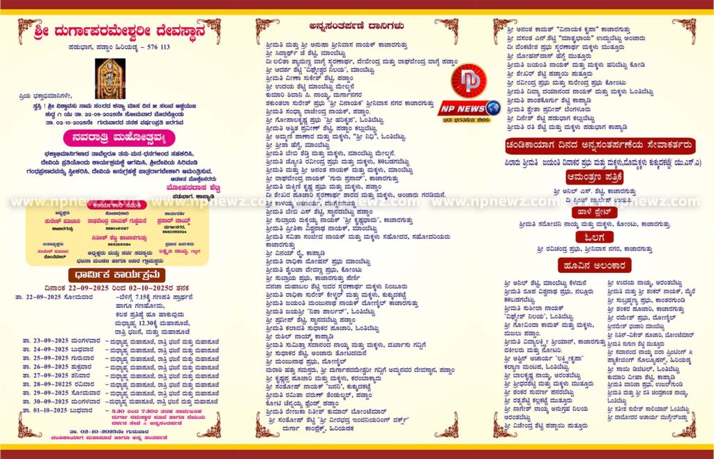 ಉಡುಪಿ : ಉಡುಪಿ ತಾಲೂಕು ಹಿರಿಯಡ್ಕ ಶ್ರೀ ದುರ್ಗಾಪರಮೇಶ್ವರಿ ದೇವಸ್ಥಾನ ಪಡುಭಾಗ, ಪಡ್ಡಾಂದಲ್ಲಿ ಸೆಪ್ಟೆಂಬರ್ 22ರಿಂದ ಅಕ್ಟೋಬರ್ 2ರವರೆಗೆ ನವರಾತ್ರಿ ಮಹೋತ್ಸವವು ವಿಜೃಂಭಣೆಯಿಂದ ನಡೆಯಲಿರುವುದು.